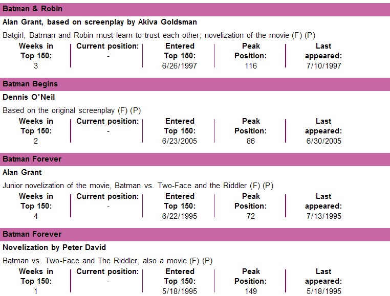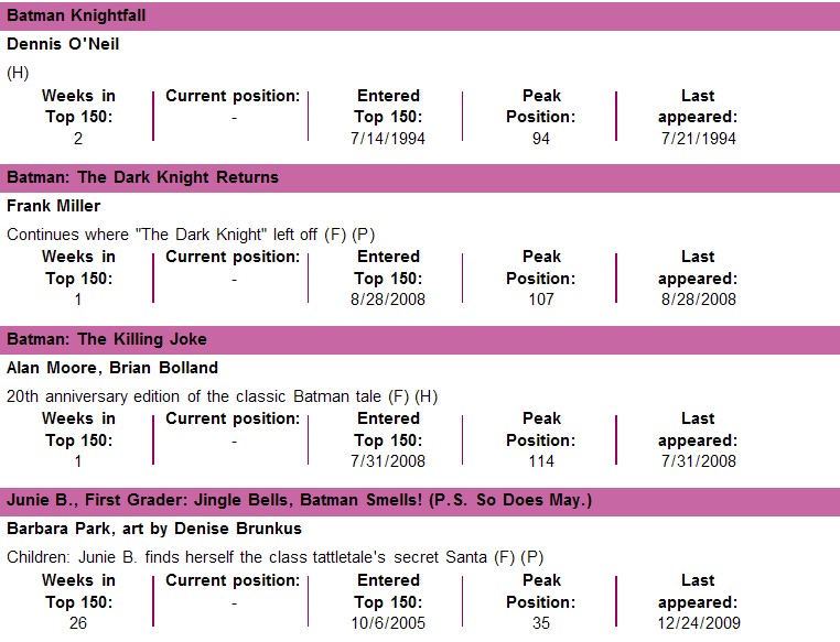 USA TODAY在每一週會放出當週銷售前一百五十名的書單排行榜,以下是美國漫畫的上榜概況: